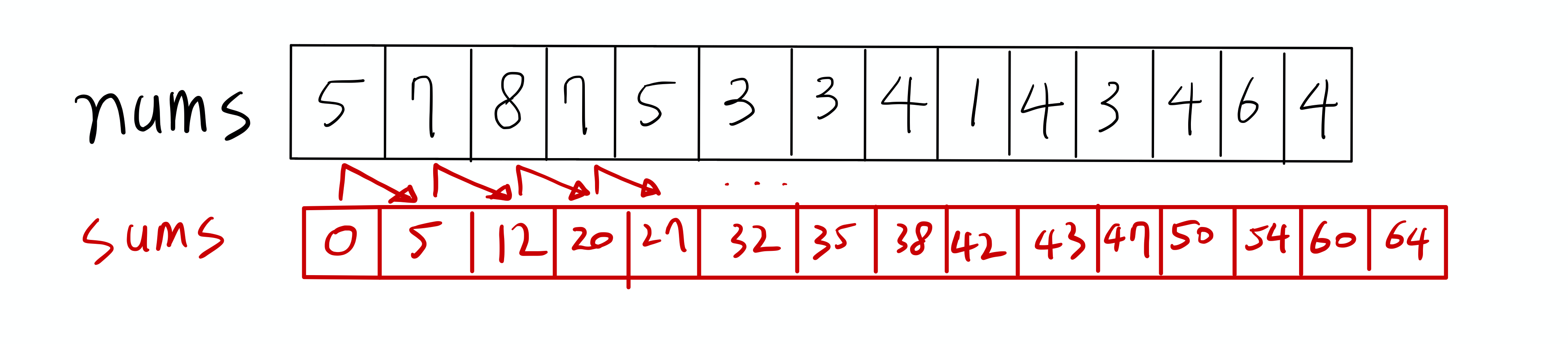 sums[0] = 0이며, sums[i+1] = sums[i] + nums[i] 입니다.