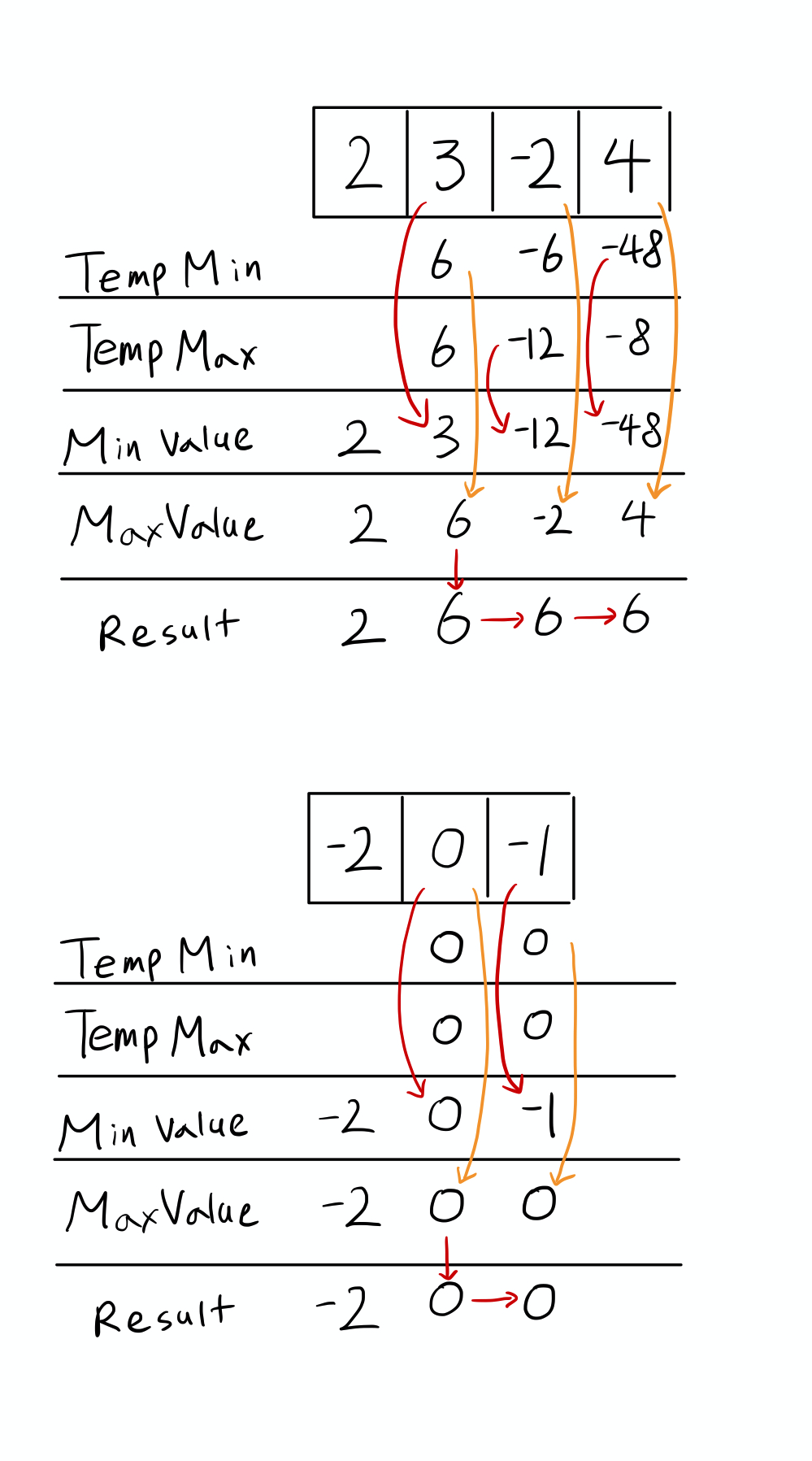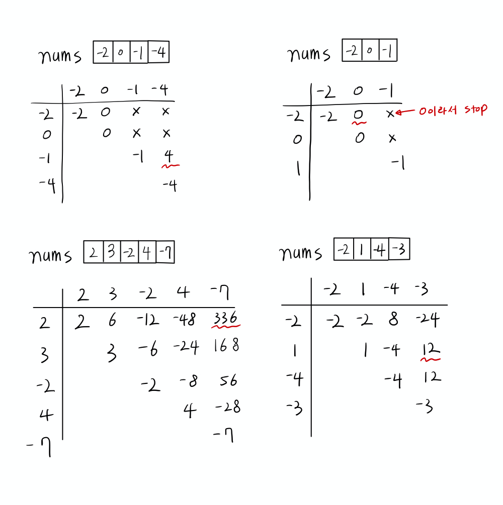 연속 곱의 경우, 음수 및 0을 통해 최소값이 최대값으로, 최대값이 최소값으로 변경되는 등 극적으로 변하는 경우가 발생합니다.