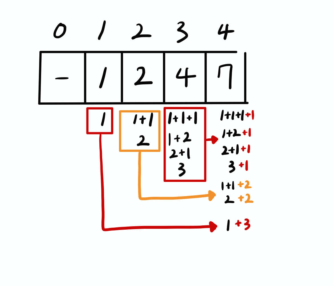(1+1+1+1), (1+2+1), (2+1+1), (3+1)는 4-1의 모든 케이스인 (1+1+1)과 (1+2), (2+1), (3)에 1을 더한 케이스고
