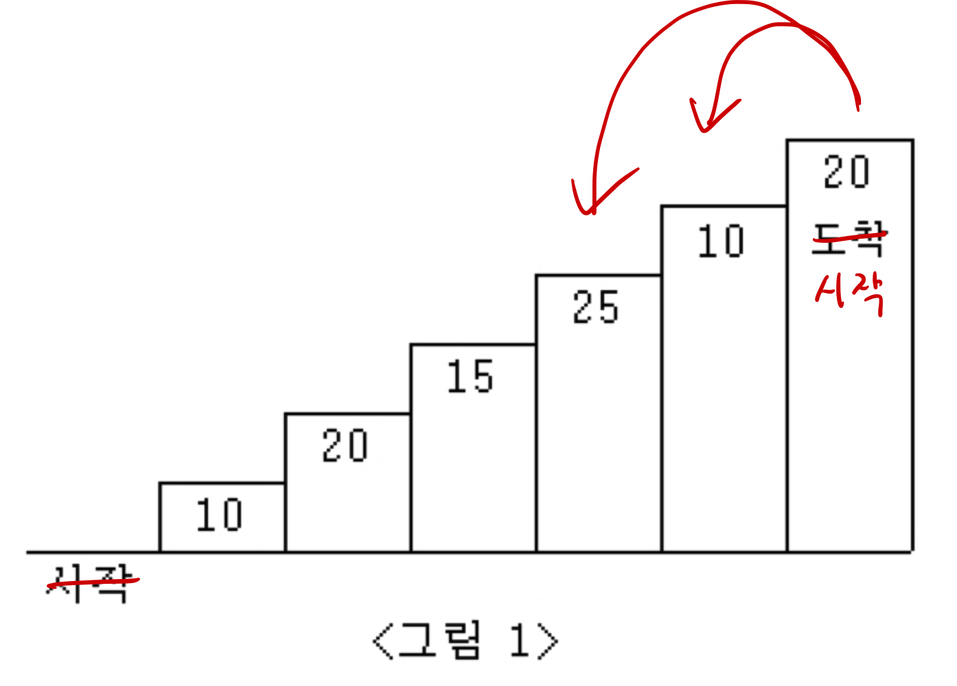 계단 오르기 게임은 계단 아래 시작점부터 계단 꼭대기에 위치한 도착점까지 가는 게임이다. <그림 1>과 같이 각각의 계단에는 일정한 점수가 쓰여 있는데 계단을 밟으면 그 계단에 쓰여 있는 점
