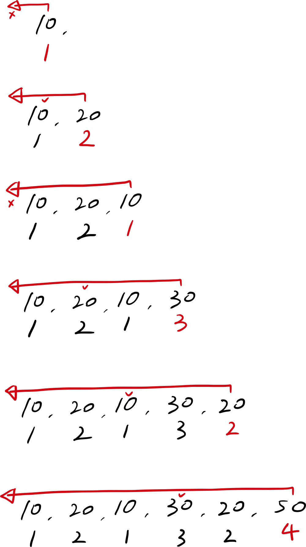 수열 A가 주어졌을 때, 가장 긴 증가하는 부분 수열을 구하는 프로그램을 작성하시오. 예를 들어, 수열 A = {10, 20, 10, 30, 20, 50} 인 경우에 가장 긴 증가하는 부분 수열은 A = {10, 20, 10, 30, 20, 50} 이