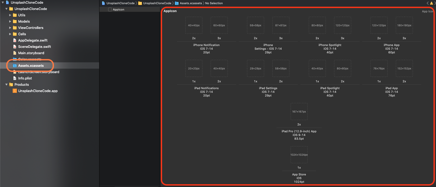 1. 앱 프로젝트의 (기본으로 생성된) Assets.xcassets 파일을 더블클릭하면 오른쪽 빨간 화면처럼 앱 아이콘 등록 창이 보입니다.