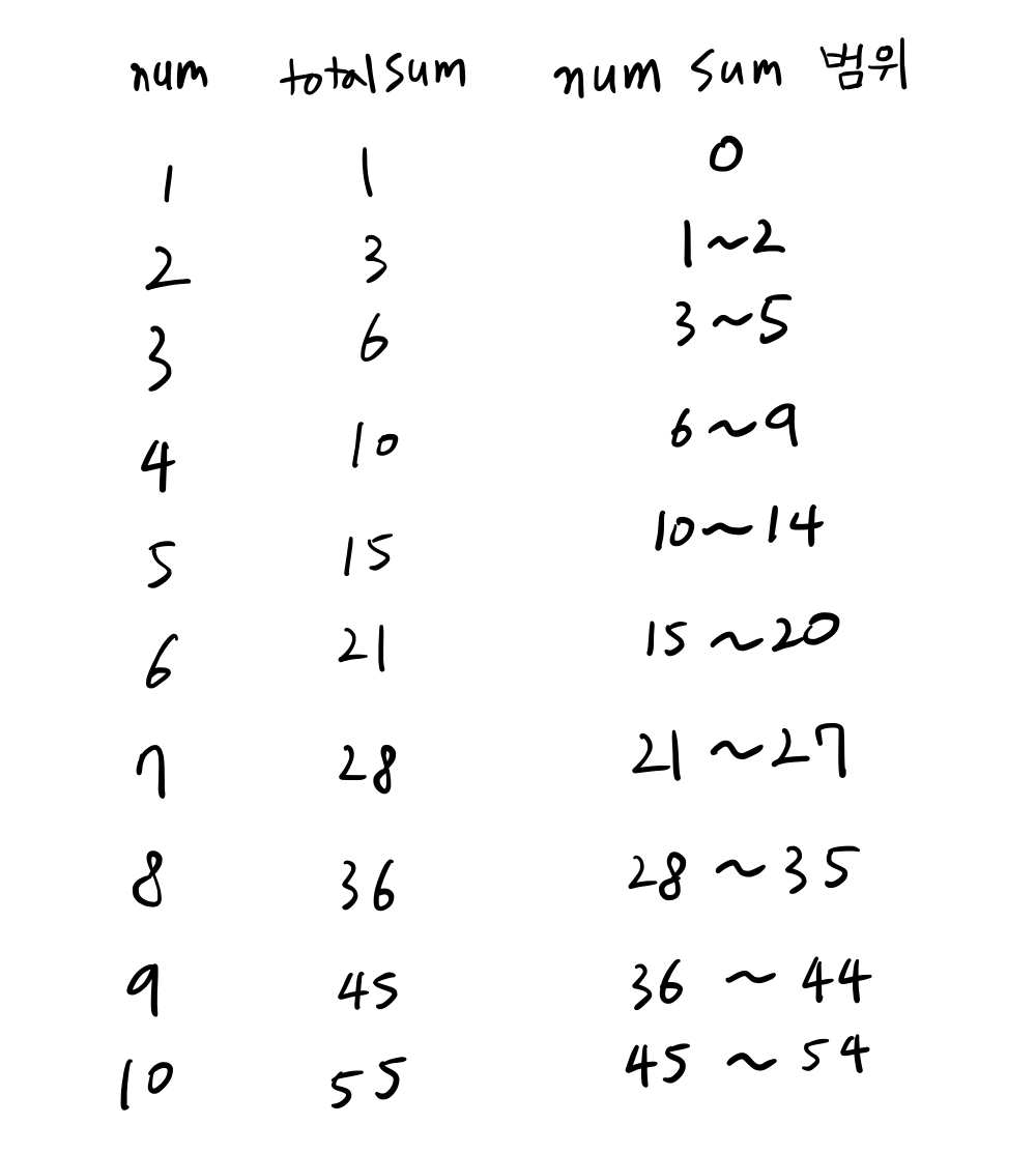 num이 k 일때, totalSum은 0부터 k까지의 합이며