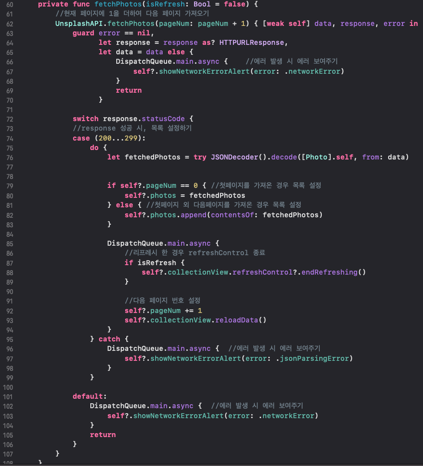22라인 : pageNum은 변경되기 때문에, 전달 받도록 했고, completionHandler 또한 넘겨 받습니다.