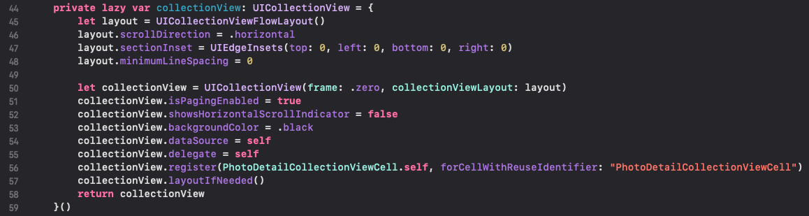 56라인 : 사진 좌우 스크롤을 구현하기 위해 collectionView와 collectionViewCell를 사용했어요. 이를 위해 cell을 등록합니다.