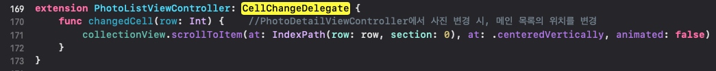 detailVC에서 셀이 변경되면, PhotoListViewController의 changedCell이 수행되어, 사진 목록VC의 center에 위치한 사진을 현재 보여주고있는 사진으로 변경합니다.