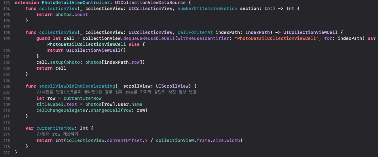 206라인 : 사진 변경이 끝나면(스크롤이 끝나면) row를 가져와, 사진 정보(title)를 업데이트 하고, cell이 변경됐다는 delegate로 전달합니다. 이는 사진목록VC로 전달되어, center로 위치한 사진이 변경됩니다.