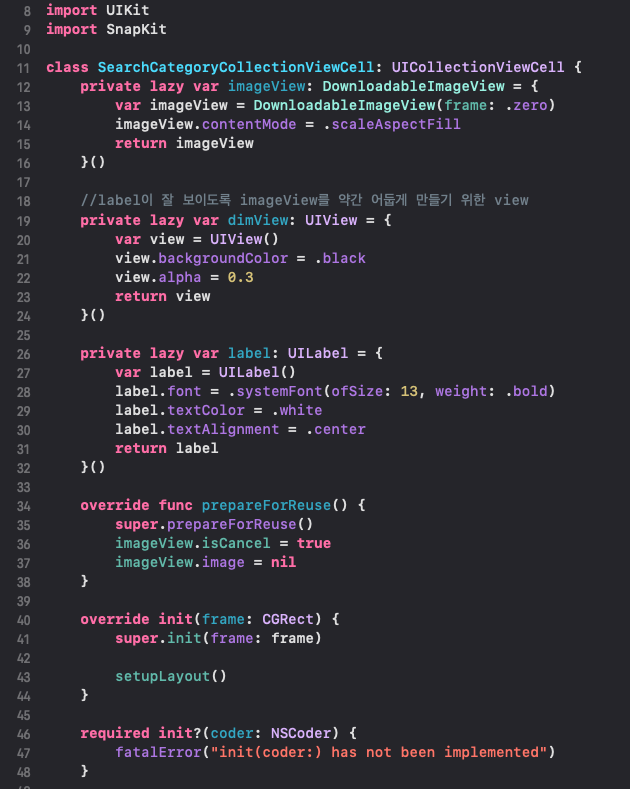 28라인 : SnapKit으로 레이아웃 제약사항을 구성해줬습니다.