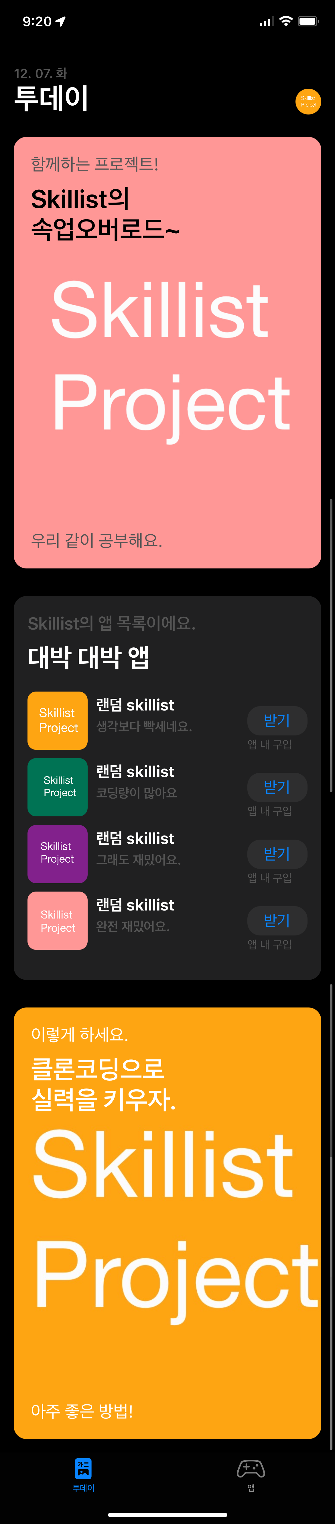섹션은 동적으로 구현했구요, 현재 기준(21년 12월 7일)으로, 앱스토어의 Today를 따라 구현해봤습니다. ㅎㅎㅎㅎㅎㅎㅎㅎㅎㅎ