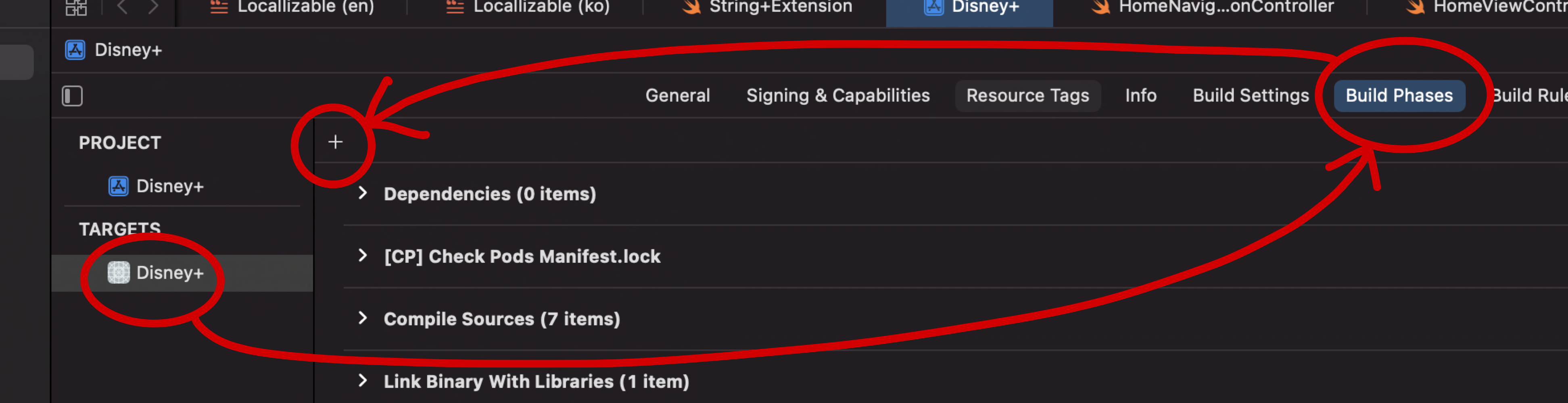 6. Xcode를 실행하여 프로젝트 설정으로 이동하여 + 버튼을 터치합니다.
