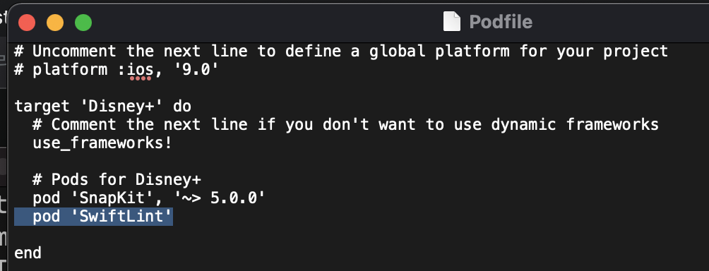 3. 다음과 같이 "pod 'SwiftLint'를 입력하고 저정해주세요