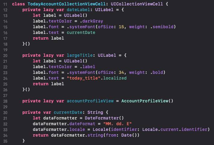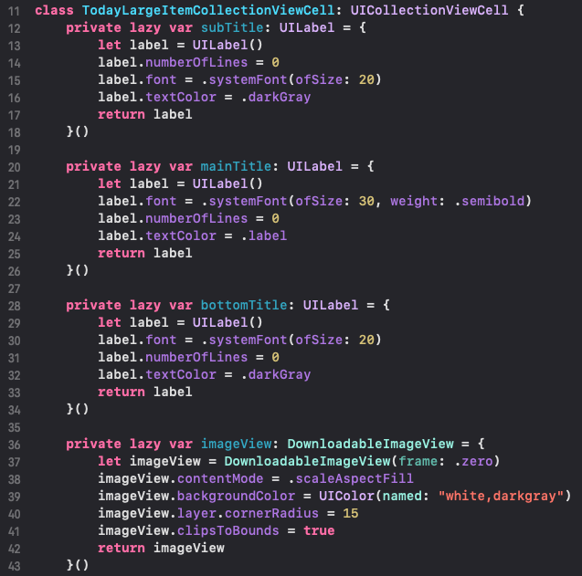 28라인 : 우측의 동그라미의 뷰인데요, AppStore를 보면 계정 사진을 보여주는 영역이죠. Today Tab 뿐만 아니라, App Tab등 재활용 하기 위하여, 따로 구현했습니다. 단순하게? 이미지뷰(url을 통해 다운할수 있도록 커스텀 했어요)에 라운드 처리로 구현했어요.