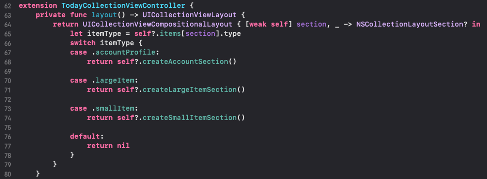 return UICollectionViewCompositionalLayout { [weak self] section, _ -> NSCollectionLayoutSection? in