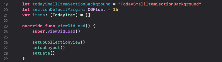23라인 : collectionView와 레이아웃(statusBar View 추가)을 설정하고 더미 데이터를 설정합니다.