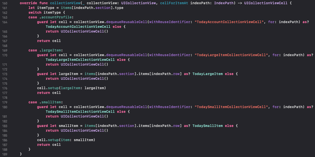 collectionView.register(TodayLargeItemCollectionViewCell.self, forCellWithReuseIdentifier: "TodayLargeItemCollectionViewCell")