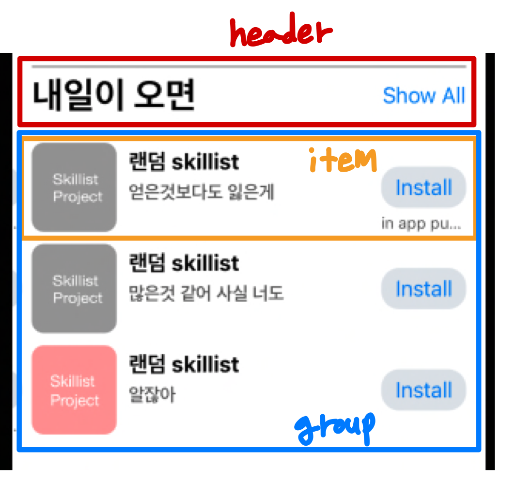 그럼, 투데이 VC와 마찬가지로, 예상이 되죠?section에 따라 header와 cell(item)으로 구현했겠죠?? 맞습니다.