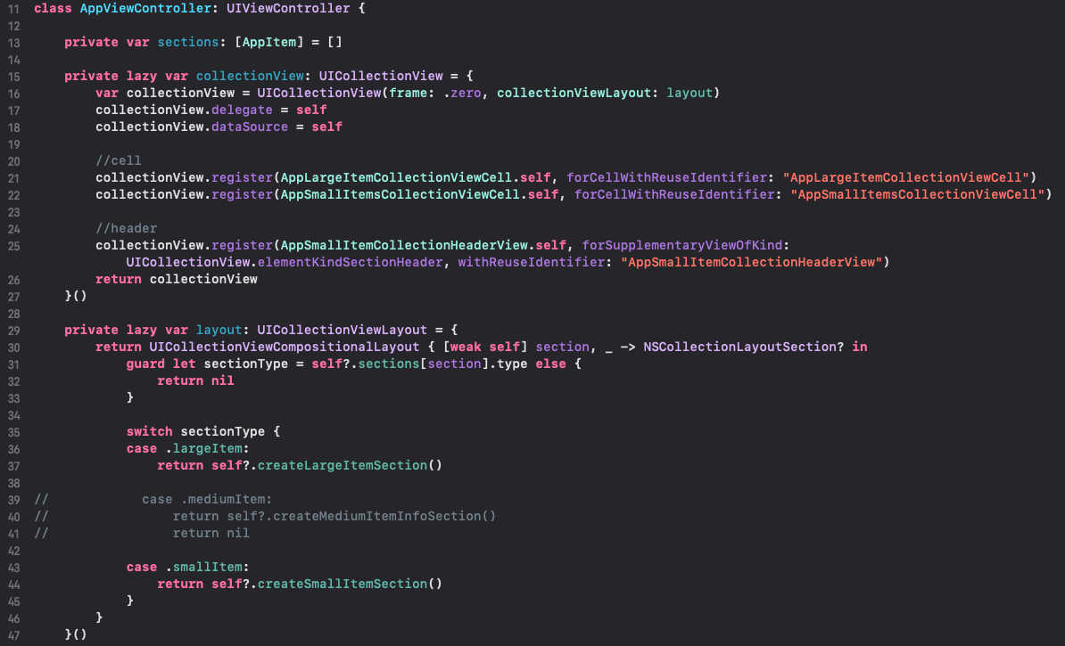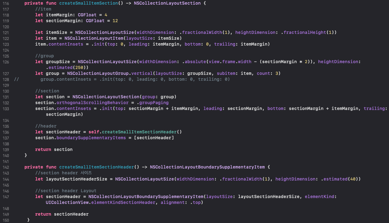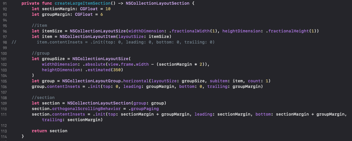29라인 : compositional layout입니다. 이번엔 프로퍼티로 구현해봤어요