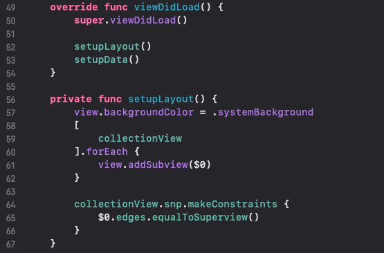 56라인 :collectionView를 추가하고, SnapKit으로 위치를 배치 합니다.