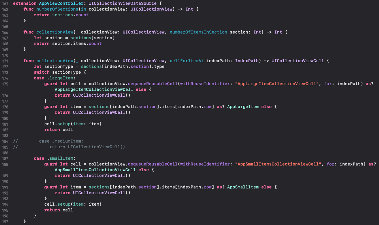 guard let item = sections[indexPath.section].items[indexPath.row] as? AppSmallItem else {