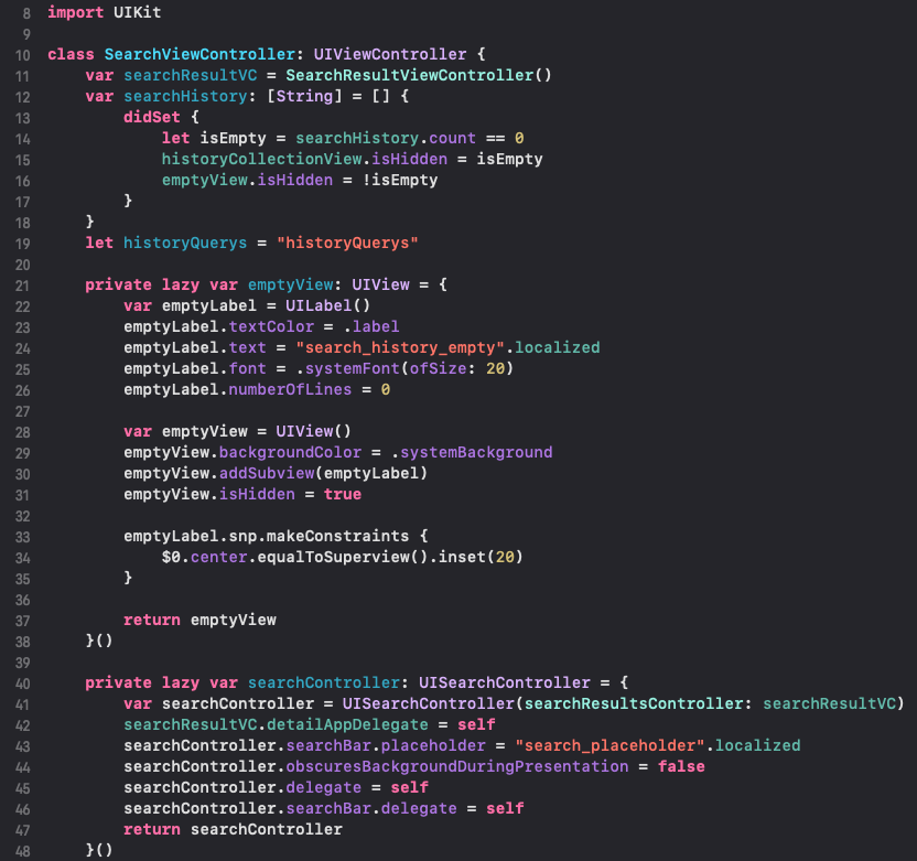 21라인 : 검색 히스토리가 없는 경우 보여주는 emptyView입니다. view에 label을 추가하고, snapKit을 활용하여 center와 여백을 지정했어요.