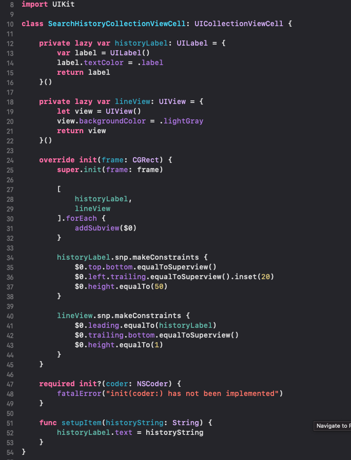 이번엔 "SearchHistoryCollectionViewCell"입니다. 쓰윽~ 한번 볼게요.