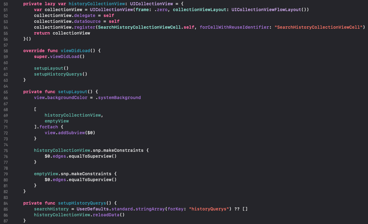 50라인 : 검색 히스토리에 대한 collectionView입니다. 검색 결과를 보여주기 위한 SearchHistoryCollectionViewCell을 등록했습니다.