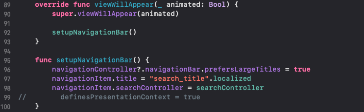89라인 : viewWillAppear에서 네비게이션바를 설정합니다. 앱 검색화면과 앱 상세화면을 넘나들거에요. 따라서 viewDidLoad가 아니라, viewWillAppear에서 네비게이션바를 설정해줘야 합니다. 그렇지 않으면 화면 이동 시 largeTitle 설정이 풀려버립니다.