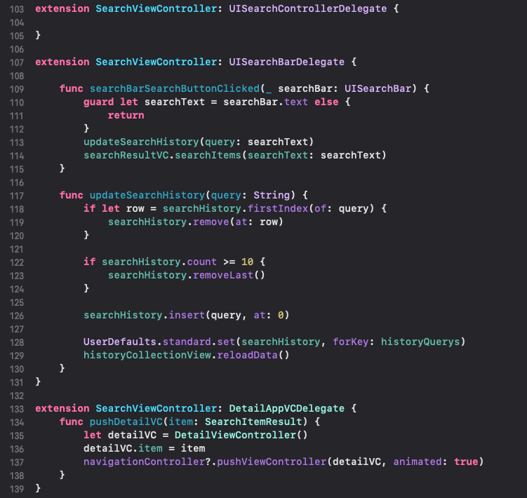 109라인 : searchBar의 검색 버튼을 터치했을때 호출됩니다. 검색 시, 입력한 text를 가져오고, 검색 history를 업데이트 하고, api 검색을 수행합니다. 검색은 searchResultVC에서 진행하기 때문에, 나중에 설명할게요~