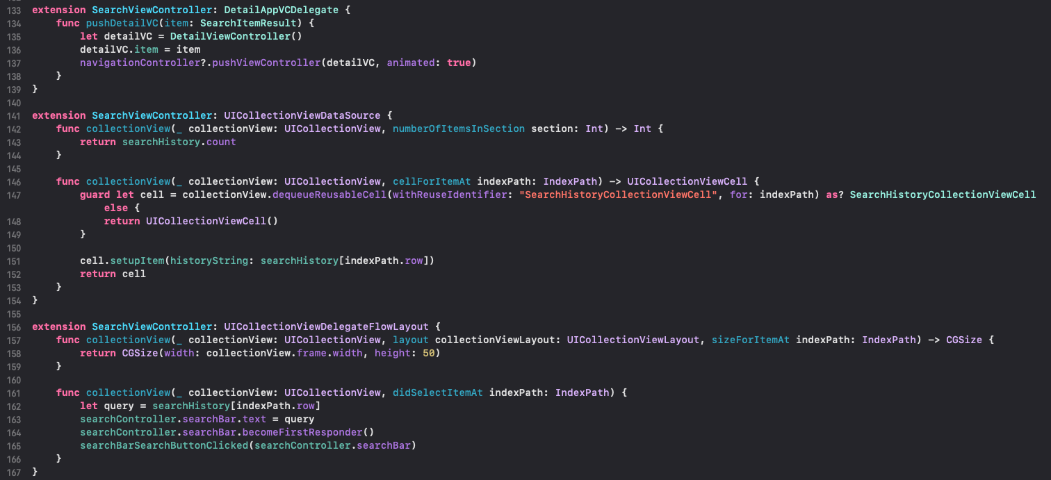 134라인 : 상세화면으로 이동하기 위한 delegate입니다. 이는 searchResultVC에서 호출합니다. 우선 패스