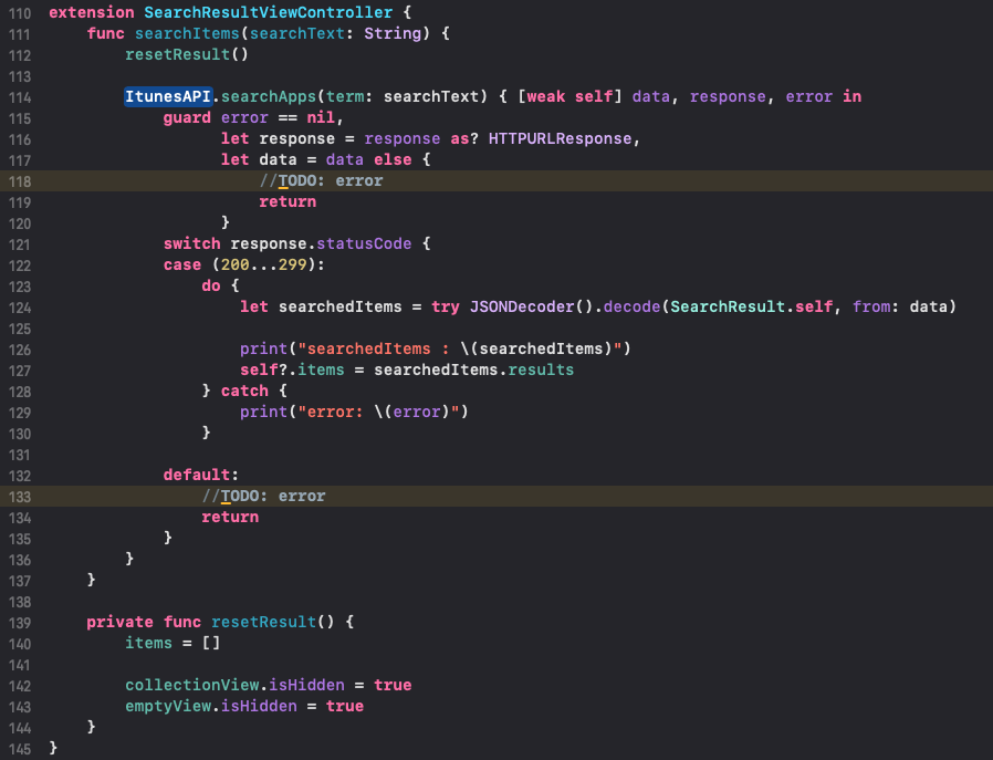 124라인 : json에서 검색 목록을 가져와 검색 결과인 item 목록을 갱신합니다. 목록이 변경되면 didSet에서 collectionView를 reload하기에, 따로 구현하지 않았습니다.