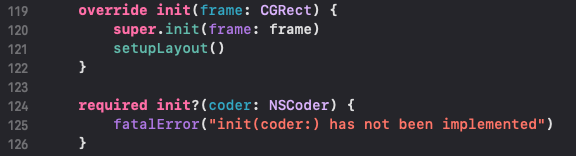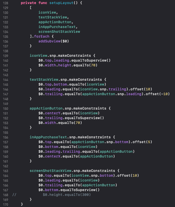 128라인 : 레이아웃을 추가하고, 제약사항을 구성합니다. snapKit에 익숙하지 않다면, 씹고 뜯고 맛보고 즐겨보세요.