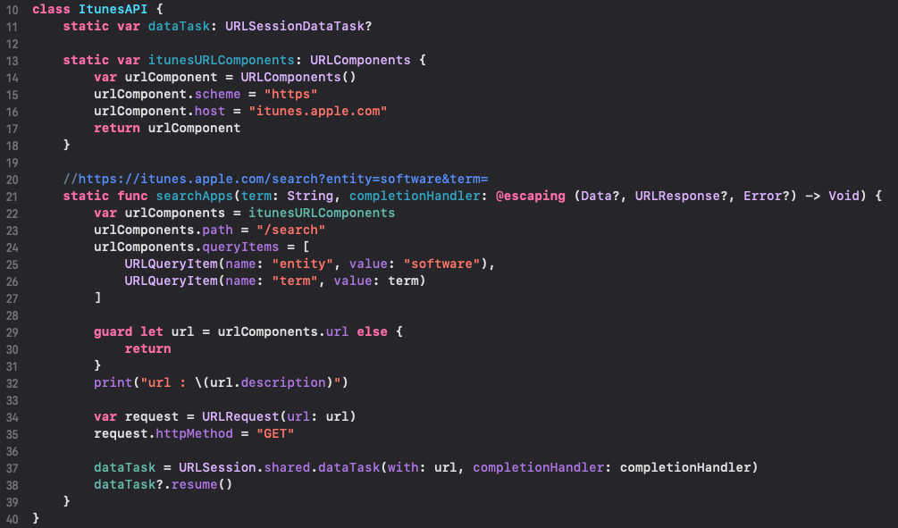 static func searchApps(term: String, completionHandler: @escaping (Data?, URLResponse?, Error?) -> Void) {