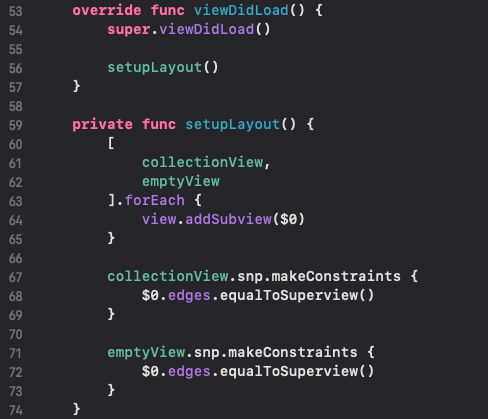 59라인 : collectionView와 emptyView를 추가하고 제약사항을 구성해줍니다.
