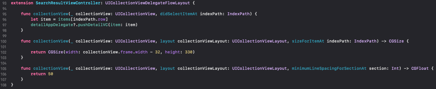 93라인 : delegate입니다. 역시 extension으로 구현했습니다.