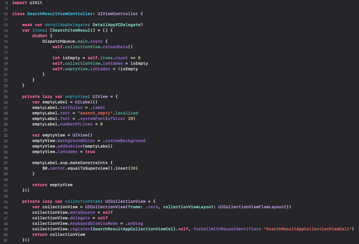12라인 : 검색목록에서 앱 선택 시 화면 전환을 지난 글에 구현했던 SearchViewController에 위임합니다. SearchResultViewController에서 navigationController?.pushViewController(vc, animated: true)수행 시, 정상 동작을 하지 않아, 화면 전환을 위임합니다.
