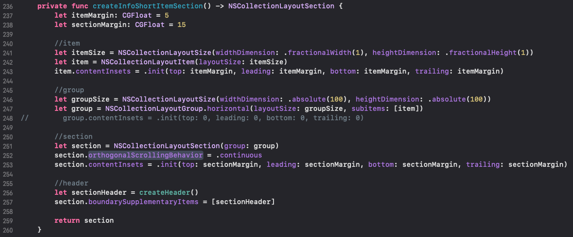 251라인 : section을 구현했습니다. orthogonalScrollingBehavior을 continuous로 설정하였습니다. 페이징 스크롤과는 다르게, 일반 스크롤처럼 동작합니다.