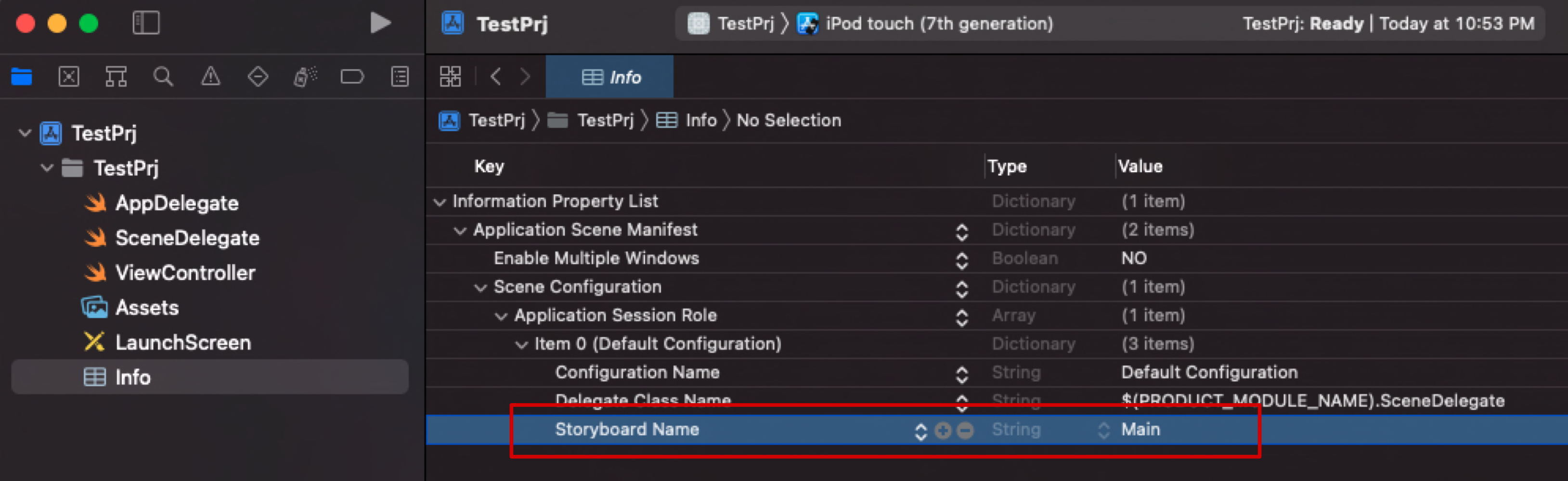 그리고 Info.plist에서 Storyboard Name을 삭제합니다.
