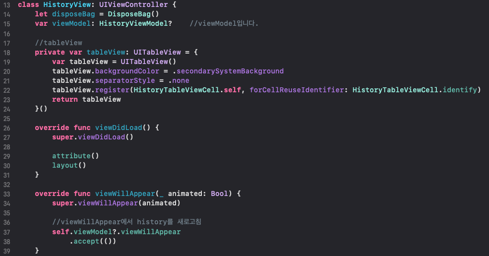 45라인 : viewModel의 history List로 tableView를 구성합니다. 제일 간단한 방법이에요.