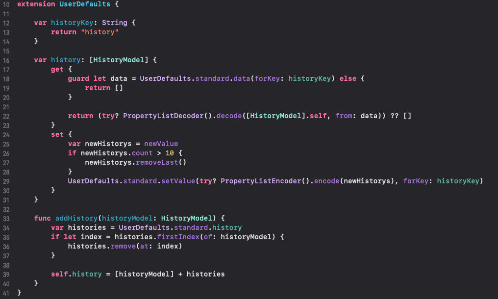 17라인 : history에 대한 get 입니다. data를 가져와, HistoryModel로 디코딩 합니다. 실패 하면, 빈 array로 반환합니다.