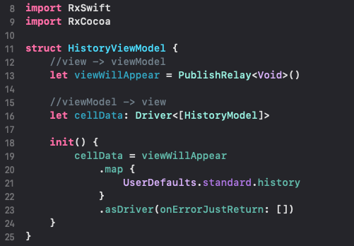 19라인 : 결국 viewWillAppear에 이벤트가 전달되면, 20라인의 map을 통해 UserDefaults에서 history 목록을 받아오고 방출합니다.