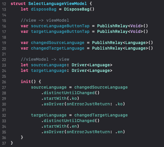 27, 35라인 : asDriver를 통해 Relay를 Deiver로 변경합니다. Driver는 error가 없고 Main쓰레드에서 수행되며 하나의 시퀀스를 share합니다. 따라서 UI관련 작업에 사용하기 좋습니다.
