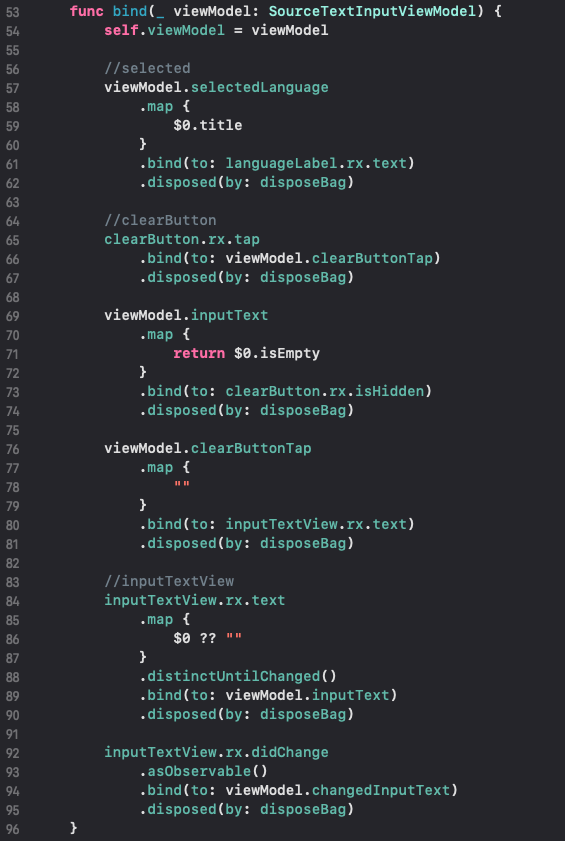 65라인 : clear 버튼을 탭하면, viewModel의 clearButtonTap으로 바인드합니다.