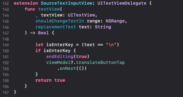 152라인 : 엔터키가 입력되면 viewModel의 translateButtonTap에 이벤트를 전달합니다.