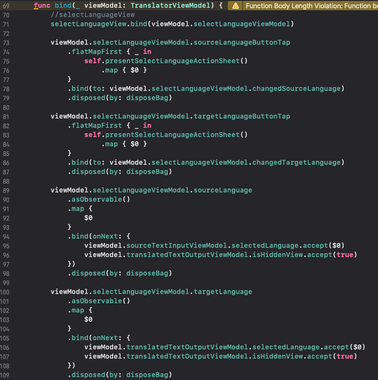 161라인 : Observable.merge()를 통해서 입력한 text가 변경되거나 clear 버튼을 터치하면, 번역 결과 View를 hide하도록 바인드합니다.