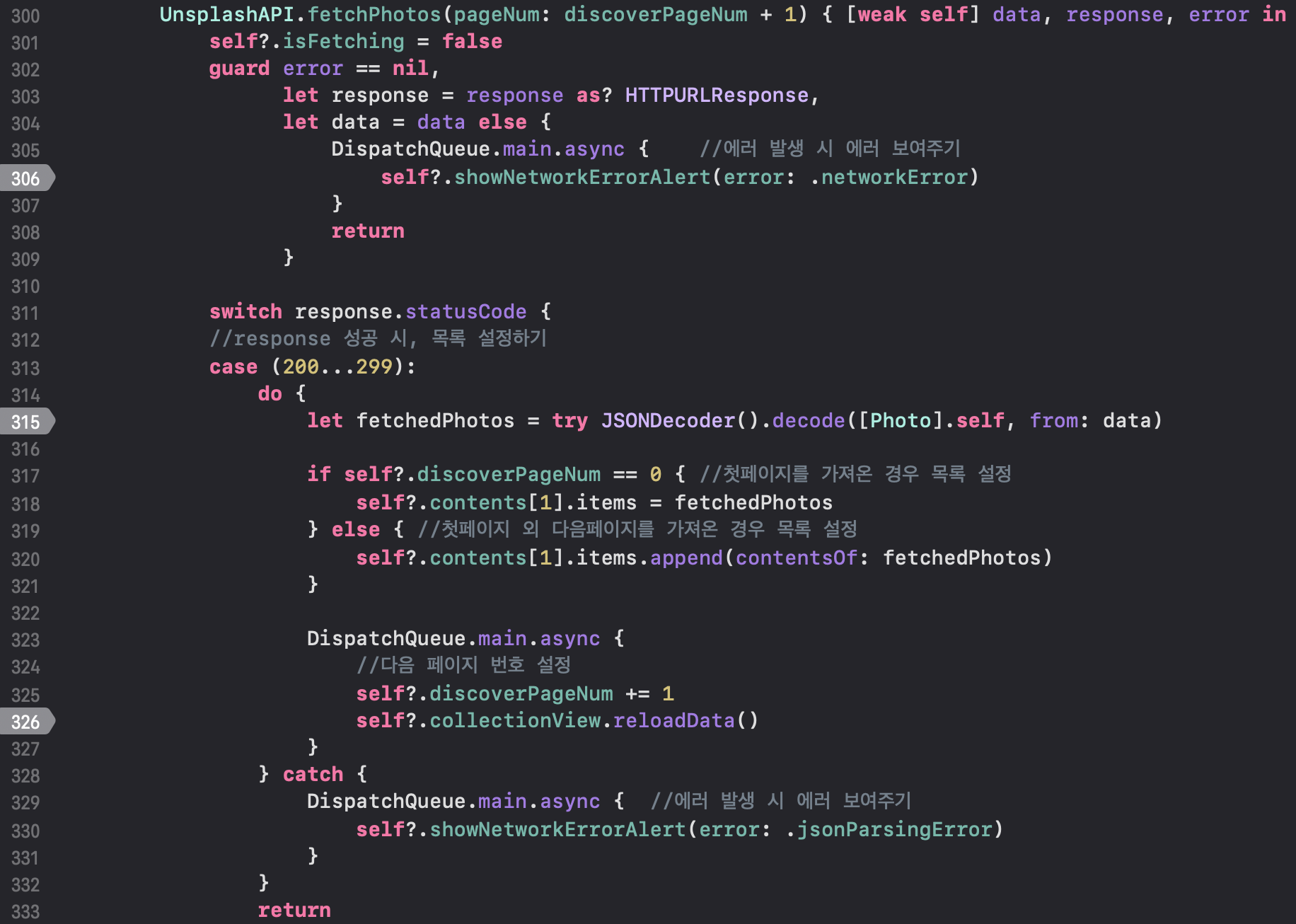 300라인에 weak self를 사용했고, 315라인에 JsonDecoder().decode도 보여요.