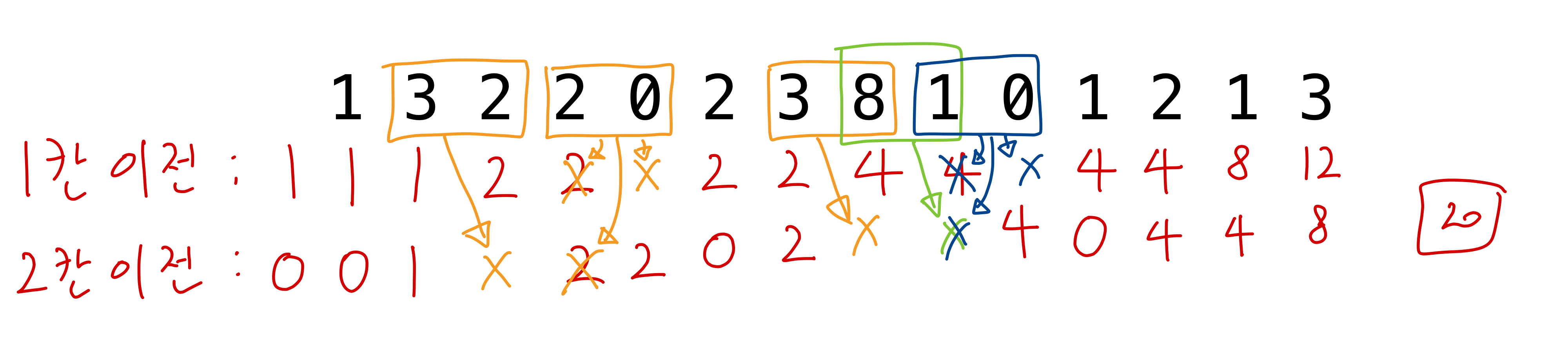 따라서, 0을 기준으로 경우의수를 따져볼때, 1칸 이전 숫자(바로 앞에 있는 숫자)에서 가져오는 경우의 수는 불가능 합니다.
